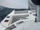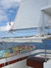 Départ de St Nazaire le 26 au lieu du 25, caprice de la météo. Tant mieux, on a pu profiter jusqu'aux derniers instants de la famille et des amis venus saluer notre départ. | Dans le sas de l'écluse nous parvenons juste à nous glisser derrière le bateau des douanes. Si nous étions partis la veille, il aurait été impossible de faire entrer en même temps dans le sas le CataFjord et le Spirit de Max. | Le bateau des douanes et son aimable équipage sont donc les seuls témoins de notre grand jour. En attendant que le niveau de l'eau descende nous leur expliquons notre projet. Dans le sas, ils nous font un signe d'au revoir timide. Mais, plus tard au large, le bateau se déroute pour venir nous saluer à grand renfort de corne de brume et d'agitement de bras avant de regagner le port. | Le nez dans les écoutes, accroché à la barre le petit héros du voyage est dans son élément et sourit à belles dents de profiter de son petit monde qui a à présent tout le temps de s'occuper de lui. |