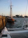 ...en effet, à notre retour de promenade Tintin et moi constatons que le Cata Fjord a été déplacé au profit de ce bateau qui fait un pélerinage vers St Jacques de Compostelle. On appelle Domi à la rescousse pour venir remplir des papiers que nous demande les autorités portuaires. |