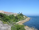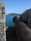 Le château domine l'entrée de la ria. Il est désormais occupé par un Parador (hôtel de luxe) mais on peut pénétrer dans les murailles et se promener tout au long du chemin de ronde et des jardins. | Les points de vue pourtant magnifique n'intéresse pas du tout notre bibou qui préfère siester. | Vue sur le Parador, et panoramas offerts par la promenade sur le chemin de ronde. | Une piscine magique. |