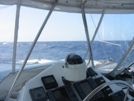 Captain Domi est concentré sur ces instruments. D'après Maxsea il devrait pouvoir amener tout son petit monde aux Açores en 5 jours. | Le Cata Fjord fend les flots. | On le surveille depuis la timonerie. | Ouahou à peine partis, on pêche un joli petit thon, ça s'annonce bien. |