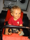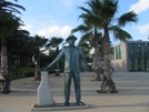 Bienvenue à Porto Santo semble annoncer cette statue au bout de la jetée où nous amarrons l'annexe. | Notre papoute prend de l'avance pour le permis de conduire : "vroumm". | La jetée "by night". | Panorama sur la baie où le Cata Fjord est mouillé. |