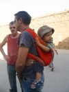 Le porte bébé étant resté en carafe au Portugal (oublié sur un quai), on opte pour le portage en écharpe. C'est top, on voit pas pourquoi on s'y était pas mis plus tôt. | Dans le souk berbère découverte d'une authentique (d'après le vendeur) cloche du Titanic, mes protestations contre l'invraissemblance de la provenance ne démonte pas une minute le vieux commerçant. | Toujours au souk, le marché des poteries. | Couché de soleil sur Tarroudant... | ... et coucher de soleil sur Agadir. |