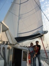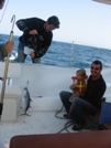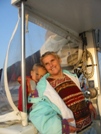 Parfois on croise la silhouette fantomatique d'un vaisseau qui erre dans les brumes crépusculaires. | Calin Manou Manou Manou. | La famille Peytavin vogue sur les flots. | Oh la belle bête, on a enfin capturé un poisson avec notre grosse canne à pêche. | Enzo n'est qu'à moitié rassuré mais complètement fasciné. |