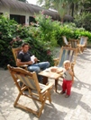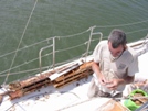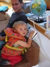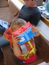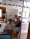 ...du dictionnaire d'anglais. Il se la pète un peu, il pourrait déjà s'améliorer en français avant d'apprendre à lire les langues étrangères. | Et pendant ce temps, passage au salon de coiffure Cata Fjord New Creation pour Domi, avec Malou aux ciseaux! | Après avoir pris connaissance de nos mails grâce à l'accès wifi de l'hôtel Kadiandoumagne (très bonne adresse pour passer des vacances) en face duquel nous sommes mouillés. Nous attaquons les gros travaux. Objectif : chasse au poid en supprimant la poutre du roof. | C'est pas une mince affaire mais les garçons parviennent à la casser. On rase tout... | ... et on refait un renfort flush (qui ne dépasse plus sur le pont comme le précédent) en stratant du carbone sur une plaque de contre plaqué. |