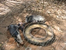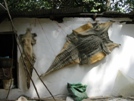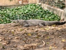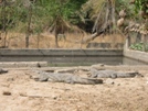 Pas de ferme sans petits cochons. | La dépouille d'un gros croco donne le ton sur la visite des cages de crocodiles adultes. | En apercevant cette mare non grillagée, on espère qu'ils ne sont pas en liberté... | ...mais non, ils prennent le soleil comme des gros lézards... | ...avachis au milieu de leurs enclos. |