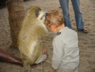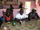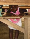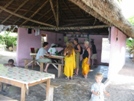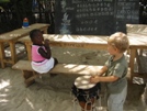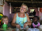 Martha aussi est la copine d'Enzo, c'est une sacré coquine passée les premiers moments de timidité. | Les frères Soumaré nous parle de l'île et de leur vie ici. | Malou tente de déguster son cochon grillé, spécialité de chez Léon, mais elle est très sollicitée par ses voisin/voisine. | Enzo montre à Martha comment faire du Djembé, on croit rêver !!! Ils ont pris place dans l'école maternelle désertée à cette heure de la journée. Enzo y a fait un court séjour, mais il n'est pas resté concentré bien longtemps. |