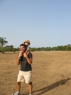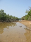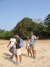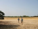 Le bébé bien calé sur les épaules de papa. | On traverse les surfaces asséchées des petits lacs qui se sont créés à l'hivernage (saison des pluies). | Antoine nous fournit pleins d'explications. | Puis on longe les bolons où les villageois viennent pêcher au filet. |