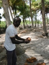 La rizière du village est exploitée à l'hivernage. Tout le village s'associe pour la cultiver. | Antoine nous ouvre une noix de coco, on se régale sur la plage. | Tintin sous un baobab. | Ce drôle d'entonnoir permet de récolter la sève des palmiers... |