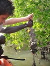 Alphonse a décidé de tuer un cochon afin de faire une fête pour le village. Nous sommes conviés à y participer. Du coup, on aide Paul et Antoine à récupérer des huîtres sur les racines de palétuviers. On les cuira le soir sur la plage en mettant le feu aux branches. |