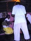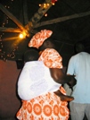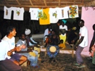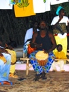Médard, Cikindo et Bambou aux Djembés, les autres à la danse. | Bambou est le cuisinier de Léon. | Ces dames dansent aussi et c'est pas les bébés accrochés à leur dos qui les empêcheront d'y mettre tout leur coeur. | On serait bien restés jusqu'au bout de la nuit. Mais hélàs on doit partir dès le lendemain matin au lever du jour à cause des horaires de marée. On a le coeur gros de quitter nos nouveaux amis. |