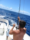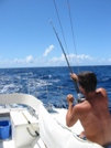 Nous reprenons la mer pour Salvador de Bahia où nous devons rester jusqu'au départ de Malou et Domi pour la France. | Et cette fois le Dieu de la pêche est avec nous. | Pour le plus grand plaisir de mon Tintin. |