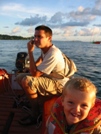 Regardez Tintin, il vient d'en boire 3 litres ! | Coucher de soleil romantique à souhait. | Nous pensions profiter un peu de la fête de Sao Joan, mais finalement nous restons sur le bateau de Catherine et David. | Ils nous invitent à passer une sympathique soirée dans leur cockpit, alors qu'Enzo et leur fils Eric regardent gentillement Bambi à l 'intérieur. |