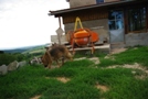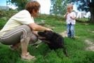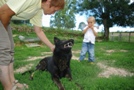 Chez Tata, il y a plein de gros bergers allemands. | Dans le jardin je reste près de papa. | Les chiens j'adore, mais il font un peu peur quand même avec leurs gros crocs. |