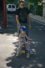 Sympa la promenade dans Vienne, c'est plein de vestiges romains. | ...Ah non lui, c'est Maxou. Il vient se dégourdir les pattes avec nous. | Moi avec mon père j'apprends à faire du vélo. | Papa et Fabrice se la joue killers. |
