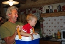 En redescendant nous avons un panorama saisissant sur le lac artificiel du barrage de Tignes. Tout un village a été volontairement inondé pour réaliser cette ouvrage. On peut le voir tous les 10 ans, lorsque le lac est vidé. | Un dîner chez Patricia. | Mamie rêveuse... | Pas pour longtemps, l'ambiance est au rendez vous. Pas de tout repos pour Lénaïs qui vient de se faire opérer des dents de sagesse. |