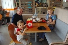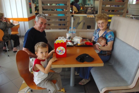 Et encore une première...après avoir passé les premiers jours surtout à siester (on a bien fait une petite balade au fort Fleur d'épée mais on avait pas l'appareil photo...désolés). Nous voila tous les 5 au Mc Do. Verdict : "Oh c'est pas plus mauvais qu'autre chose."