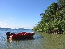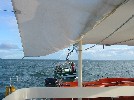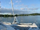 Carène débarrassée de ses 4 cms d'algues et coquillages, Catafjord glisse pour une escapade vers les chutes de Tororo en compagnie de "Fleur de Méninge" et de Brigitte et Jean-Mi ses heureux propriétaires | 2 heures de navigation sous un soleil radieux, et voilà les 2 bateaux gentiment ancrés dans le mouillage sauvage de Tororo | Le seul bruit de la chute d'eau toute proche du bateau nous remplit de quiétude. |