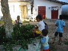 Les enfants jouent paisiblement | Le lendemain, après quelques palabres l'annexe de Françoise a enfin trouvé l'endroit où elle attendra son équipage qui part en expédition pédestre à Morro de Sao Paulo | Notre promenade par la plage pour rejoindre Morro passe par les "boues rouges" qui vous guérissent de tous vos maux | Domi et Nathalie ne se roulent pas dans la boue, mais s'enduisent leurs bobos |