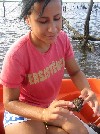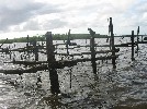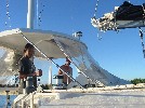 Nous filons voir Tania et Cintia qui comptaient sur nous la veille pour manger des huitres cuites sur la plage, et nous avons mal reçu le message | Elles nous accompagnent avec l'annexe pour nous monter leur culture d'huitres | Elles préparent des colliers d'huitres vides qu'elles viennent accrocher ici | Et 12 à 18 mois plus tard la récolte peut_être cueillie. |