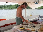 Il y a auusi les journées plus studieuses consacrées à l'entretien et aux améliorations | Il serait temps de reprendre l'entrainement, car le cadeau de Noël ne sort pas très souvent de son étui | Les Ibis rouges viennent jusque la marina . Bien que protégée, leur population a été divisée par 10 en moins de 15 ans | Petite Escale à Degrad Stoupan sur le Mahury , à 6 milles de Degrad De Cannes |