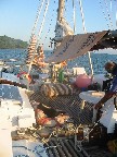 Isolement, promenade minimale et obligation de silence font partie de la vie des bagnards de St Joseph | Des ouvertures munies de barreaux, aux plafonds des cellules permettaient une surveillance continue | Revenons à une vie plus légère. Marc, organise avec son cata l'Albatros des croisières; et nous ramène le pain frais de Kourou | Il ramènera aussi de l'essence pour Miguel et Daniela, arrivés directement de Salvador et en panne de moteur |