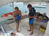 Le nettoyage de la coque, revient souvent dans les eaux chaudes,: avec Laurence nous testons un compresseur avec embout de plongée |