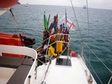 Petite pause à Bequia . Nous y retrouvons le Passpartoo de Bettina et Serge (connus aux Canaries), et Eloanne rencontré à Cayenne | Voilà les 5 mousses de Eloanne, le grand fils de Bettina, et Serge |