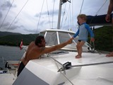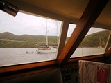 Tellement surprise par un jaguar qui nous regarde à 10 mètres, je sors très tardivement mon appareil photo alors qu'il s"en va | A l'aube du 3ème jour, nous découvrons avec surprise 5 autres voiliers dans la baie. Nous les connaissons déjà de Curaçao |