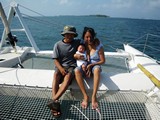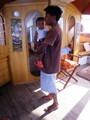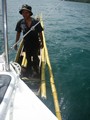 David revient de la forêt sur le continent; il est allé nous chercher 2 bambous qui nous serviront de tangons! |