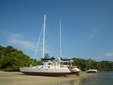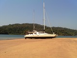 Le lendemain nous allons à marée haute sur la plage; à marée basse nous nettoyons les coques et faisons la première couche d'antifouling |