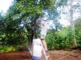 Sa chienne Bella, les chèvres, les poules sont souvent sa seule compagnie...Cest son mari qui allait tous les 3 mois à Panama avec leur petit bateau, faire les appros | Elle commence à manquer de certaines denrées; et nous lui apportons les vivres qui lui font défaut et que nous avons à bord | En contrepartie, on s'équipe de 3 grands seaux, et nous partons à la cueillette des agrumes. |