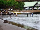 Un peu timide au début sur Catafjord, la voilà bien délurée quand nous les rejoignons pour dîner! | La course de pirogues s'achève. Un sacré effort pour les compétiteurs, l'occasion pour certains spectacteurs d'abuser un peu de la bière locale! |