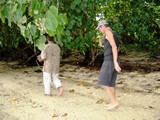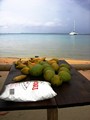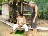 Et dès 9h30 nous entreprenons la préparation du ma'a au four tahitien (le ahi ma'a). On commence par la récolte des noix de coco | Apprentissage de la technique pour râper les cocos |