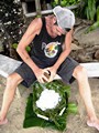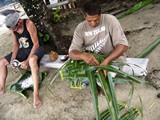 Avec les feuilles de cocotier Siki fabrique un plat pour recevoir la noix de coco râpée |