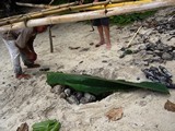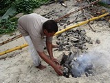 On y fait un feu de bois | destiné à chauffer les pierres vocaniques qui serviront à la cuisson |
