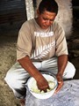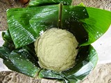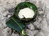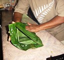 Confection du poe de potiron qui est enveloppé dans les feuilles et attend d'être enfourné | Préparation de l'ipo. Le lait de coco est obtenu en pressant dans un torchon la noix de coco râpée. |