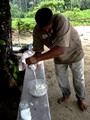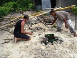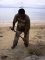 D'abord on recouvre les mets avec un tapis de feuilles de bananier | Puis des sacs humides (ce pourrait être aussi des feuilles de pureau) . L'ensemble est recouvert de sable. La cuisson commence! |