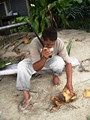 Nouvelle séance pour obtenir encore du lait de coco . Ramassage de nouvelles noix; enlèvement de la bourre |