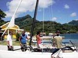 Petit passage par Fare avant de quitter Huahiné pour un dernier moment avec Laurence, Pauline et Olivier de la pension Guynette . Olivier part à l'entraînement | Nous partageons avec Pierre Cosso (cf La Boum N°2) et Rautea les aventures et mésaventures de leur Hobie-cat 21, et un dîner très sympa à bord de leur Catana "Nusa Dua" |