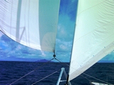 Navigation tranquille sous génois et genaker; on aperçoit Maupiti |