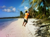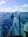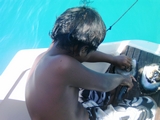 Le lendemain nous déménageons vers le Sud de l'atoll, et nous avons la visite de Tetuanui qui arrive à la rame sur un flotteur de planche à voile | Pour son grand plaisir, chaque fois que nous le ramenons à terre, on le remorque derrière l'annexe. 9 personnes seulement habitent Mopélia |