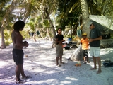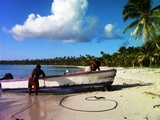 La barque sert à la pêche, et aussi pour se déplacer dans l'atoll car ils cultivent le coprah sur tout le motu |