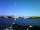 Les paquebots alimentent l'écomomie touristique de Nouméa; faut bien veiller à pousser les fesses de Catafjord quand ils passent dans le chenal | Notre ami Jean-François nous conduit à l'aéroport pour notre escapade en France, et Catafjord reste sous l'oeil vigilant des grands marins Thérèse et Alain de NGA |