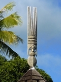 La dosette, si utile au boulanger, est retrouvée, après quelques jours de fugue, dissimulée dans une boîte de riz | Le temps de poser l'annexe sur la plage, et nous partons à la découverte des curiosités locales | La flèche faîtière est une sculpture de bois qui orne le toit des cases cérémonielles et incarne l'ancêtre fondateur d'un clan |