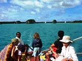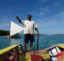 La baie d'UPI en superbe toile de fond, nous glissons sur l'eau en devisant gentiment avec les autres passagers de la pirogue |