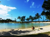 D'ailleurs à Airlie, les gens ne se baignent pas dans la mer, mais dans un lagon aménagé , où ils se prélassent dans l'eau, sur le sable ou sur l'herbe |