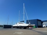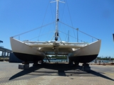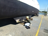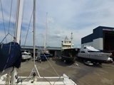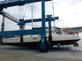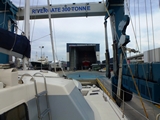 17 novembre, dans les sangles du "travlift" de 300 tonnes à Rivergate Marina; avec nos 18 tonnes on ne devrait pas le faire défaillir |