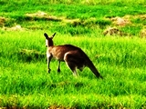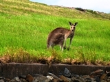 En face de la marina, un pré où nous nous attardons à, enfin, pouvoir observer les kangourous dans la nature |