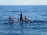 Nombreuses rencontres en mer de pirogues traditionnelles avec moteur sur le côté |