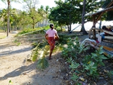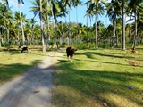 Une cocotteraie sépare le village de la plage |